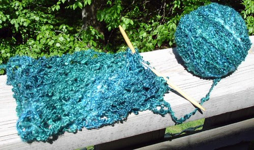 I finally decided what to do with the silk/mohair boucle that I bought at Rhinebeck. I'd been searching Ravelry for a pattern, and nothing worked well with the boucle, so I'm back to the veil stitch in the round. So far so good, though slow to knit due to the bumps.